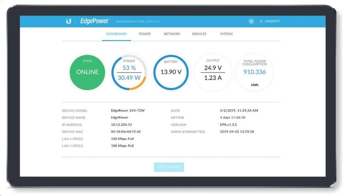 Pro připojení napájených zařízení jsou k dispozici 2 ethernetové porty s možností pasivního 54V PoE Out, rychlostí 100Mbps a 1 výstup na svorkovnici. EdgePower je možné spravovat přes aplikaci UNMS nebo ve vlastním webovém rozhraní. Samozřejmostí je podpora protokolu SNMP.