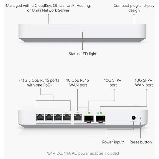 Popis produktu UXG-Fiber je kompaktní 10 gigabitový router, který disponuje (1) WAN 10Gbps portem, (2) 10Gbps SFP+ porty (1x WAN, 1x LAN) a (4) LAN 1/2.5Gbps porty s jedním PoE-OUT portem s podporou PoE+ 802.3af/at. Kompaktní, ale výkonné provedení tak podporuje funkci multi-WAN včetně možnosti load balancing, nechybí ... více