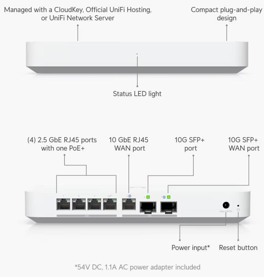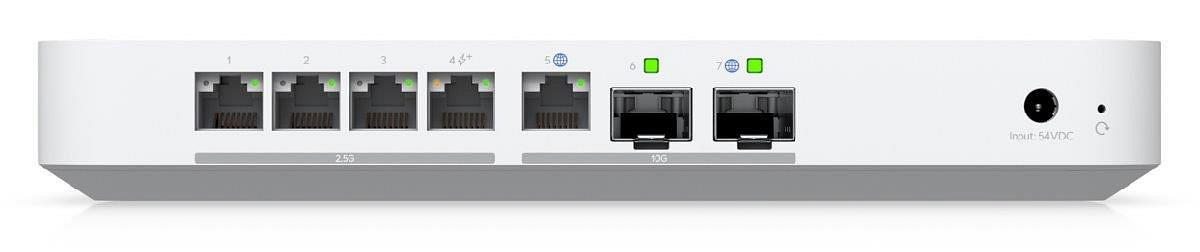 Popis produktu UXG-Fiber je kompaktní 10 gigabitový router, který disponuje (1) WAN 10Gbps portem, (2) 10Gbps SFP+ porty (1x WAN, 1x LAN) a (4) LAN 1/2.5Gbps porty s jedním PoE-OUT portem s podporou PoE+ 802.3af/at. Kompaktní, ale výkonné provedení tak podporuje funkci multi-WAN včetně možnosti load balancing, nechybí ... více
