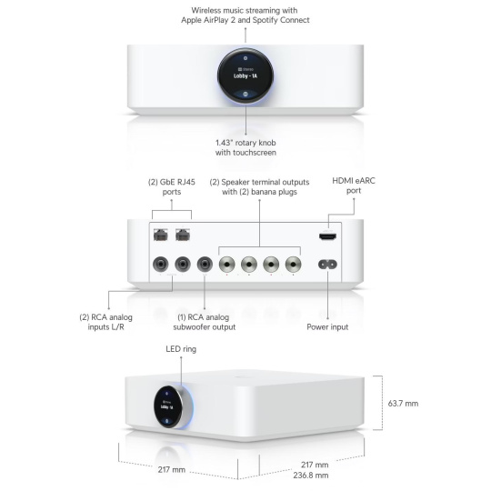 Ubiquiti UniFi PowerAmp Prémiový zesilovač navržený pro vysoce věrné vícezónové streamování zvuku a pohlcující prostorový zvuk. Nabízí výkon 130 W na kanál při 8 ohmech a poskytuje výkonný, pohlcující zvuk s podporou Dolby Atmos a Dolby TrueHD, což zaručuje prvotřídní zážitek z poslechu. UniFi PowerAmp se bezproblémově integruje s A/V UniFi pro pro jednotné nastavení sítě a zvuku, které lze snadno spravovat prostřednictvím mobilní aplikace UniFi Play. UniFi PowerAmp můžete umístit na jakýkoli rovný povrch, takže je ideální pro domácí i profesionální prostředí. Jeho kompaktní design také umožňuje instalaci do racku, kdy se dva PowerAmpy vejdou vedle sebe do 2U racku. Zařízení funguje samostatně bez nutnosti použití konzole UniFi a nabízí možnost plug-and-play instalace pro uživatele, kteří chtějí okamžitý přístup k vysoce kvalitnímu zvuku prostřednictvím analogových vstupů nebo síťového streamování přes Apple AirPlay 2 a Spotify Connect. Bezdrátové streamování zvuku s nízkou latencí díky Apple AirPlay 2 a Spotify Connect 130 W na kanál při 8 ohmech (260 W při 4 ohmech) 1,43" otočný potenciometr s dotykovým displejem 2× výstup pro reproduktor (součástí balení 2× redukce se svorkami) 1× analogový výstup RCA pro subwoofer 1× analogový vstup RCA (pro levý a pravý kanál) 1× vstup HDMI eARC s pohlcujícím prostorovým zvukem Dolby Atmos Možnost vytvořit skupinu až 32 zařízení UniFI PowerAmp Snadné nastavení, správa a ovládání skupin pomocí mobilní aplikace UniFi Play UniFi PowerAmp umožňuje seskupit až 32 jednotek pro vícezónové ovládání a zajistit tak komplexní správu zvuku ve více prostorech. Ať už přidáváte další pasivní reproduktory nebo vytváříte nové zvukové zóny, UniFi PowerAmp poskytuje výkon, flexibilitu a snadné použití nezbytné pro jakoukoli moderní audio sestavu. ZÁKLADNÍ SPECIFIKACE Výkon: 130 W při 8 ohmech na kanál 260 W při 4 ohmech na kanál Rozhraní: Wi-Fi (802.11a/b/g/n/ac), 1× audio vstup (RCA), 1× výstup pro subwoofer (RCA), 2× audio výstup pro reproduktor (2× L/R), 1× HDMI eARC vstup, 2× GbE RJ-45 Napájení: AC 100–240 V; 2,5 A; 50/60 Hz; příkon 17 W Rozměry: 236,8 × 217 × 63,7 mm Hmotnost: 2,4 kg.