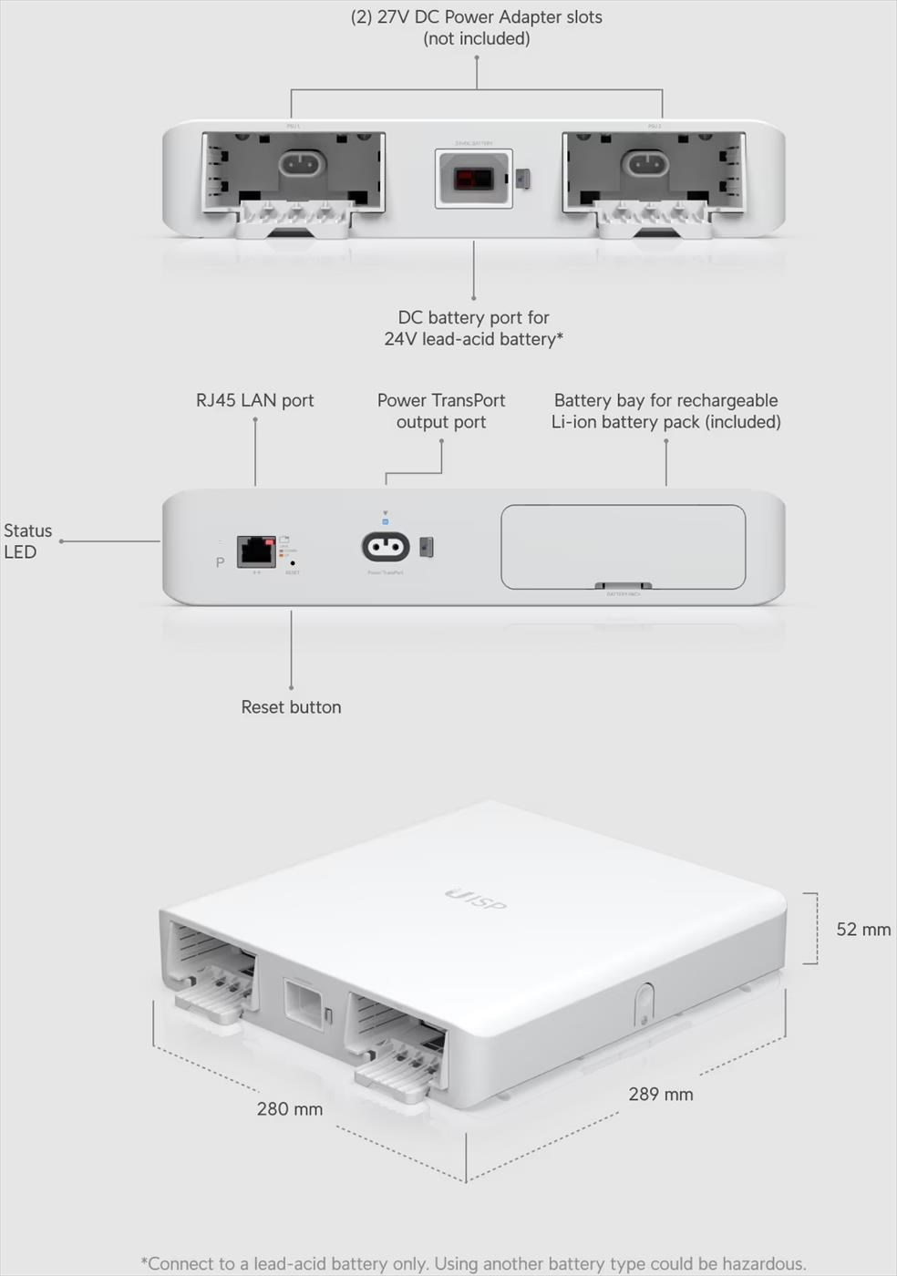 Popis produktu Nepřerušitelný systém napájení je vyvinutý pro zálohané napájení dalších produktů ze série UISP, která zahrnuje routery a switche. Samostatně prodávaný propojovací kabel UACC-Cable-PT je dostupný v různých délkách od 0.5m až do 50m a kabely různých délek je také možné spojovat pomocí venkovní kabelové spojky UACC-Cable-PT-Ext. UISP-P lze napájet jedním nebo dvěma zdroji UACC-Adapter-PT-120W, které jsou k zakoupení samostatně. Přiopjením jednoho zdroje získáte výstupní výkon 100W, se dvěma zdroji je pak možné využít dvojnásobný výkon 200W. Pro funkci zálohovoání je součástí balení Li-ion battery pack s výkonem 115 Wh a externě lze připojit také olověnou baterii s napětím 24V. Pro připojení do datové sítě slouží jeden ethernetový port 10/100Mbps. Konfigurace a správa zařízení probíhá v aplikaci UISP, které je dostupná pro iOS a Android. Kompatibilní zařízení: • UISP-Console • UISP-R (instalovaný v UISP-Box) • UISP-R-Pro • UISP-S (instalovaný v UISP-Box) • UISP-S-Pro Obsah balení • Záložní zdroj • Li-ion battery pack • Vrtací šablona • Držák na zeď • (4) Šrouby a hmoždinky • Zajišťovací šroubek • Propojovaví kabel externí baterie Technické parametry Napájení Funkce nabíjení:Ano Výkon [W]:200 Výstupní napětí [V]:27 Výstupní proud [A]:7,4 Fyzické charakteristiky Provozní teplota [°C]:-5 až 40 Hmotnost [g]:1400 Šířka [mm]:280 Výška [mm]:52 Hloubka [mm]:289.