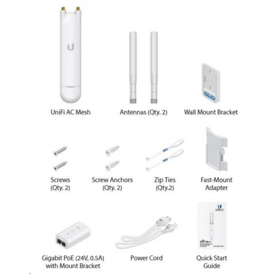 UniFi AP AC Mesh je venkovní voděodolné mesh AP s celkovou propustností až 1167Mbps (2.4GHz 300Mbps + 5GHz 867Mbps), Disponuje 2x2MIMO všesměrovými dualband. 3dBi (4dBi pro 5GHz) antény s výkon rádia 20dBm jak pro 2,4 tak i 5GHz současně. Podporuje standardy 802.11a/b/g/n/ac, disponuje jedním gigabit.ethernet. portem. Lze napájet prostřednictvím aktnivního PoE dle 802.3af případně pasivního (24V DC), PoE adaptér je součástí balení (pasivní). Maximální spotřeba činní 8,5W.