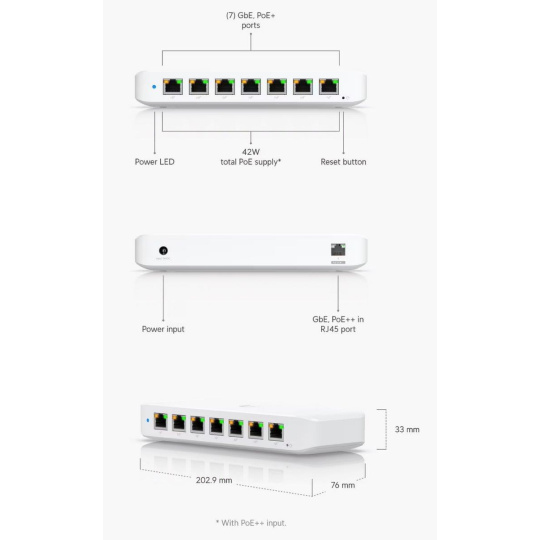 Popis produktu Kompaktní 8 portový gigabitový PoE switch. Switch disponuje 1 PoE in portem a 7 PoE out porty s podporou PoE napájení 802.3af/at s maximálním zatížením až 30W na port. Switch je spravován pomocí aplikace UniFi network umožňující centrální správu Vaší sítě včetně cloudového přístupu. Maximální PoE budget switche je závislý na způsobu napájení: • při napájení DC adaptérem 54V/3,9A (součástí balení) je PoE budget 202W • při napájení pasivním PoE adaptérem nebo 60W PoE++ adaptérem je PoE budget 45W Obsah balení • switch • napájecí adaptér 54V/3,9A • montážní set Technické parametry Konektory a rozhraní Rychlost LAN:(8) 10/100/1000Mbps Napájení Typ napájení:DC konektor, PoE Typy PoE:PoE-Out + PoE-In Podporované PoE-Out standardy:802.3af, 802.3at Počet PoE Out portů:7 PoE budget [W]:202 Max. spotřeba energie [W]:60 Napájení přes konektor/svorkovnici:44 .. 57V DC Fyzické charakteristiky Provedení:Na zeď, Desktop Ventilátory:Bez ventilátoru Šasi:Plastové Tlačítka:Reset Provozní teplota [°C]:-15 až 45 Šířka [mm]:203 Výška [mm]:33 Hloubka [mm]:76 Obecné Rychlost přepínání [Gbps]:8 Software Management:UniFi controller Funkce:VLAN.