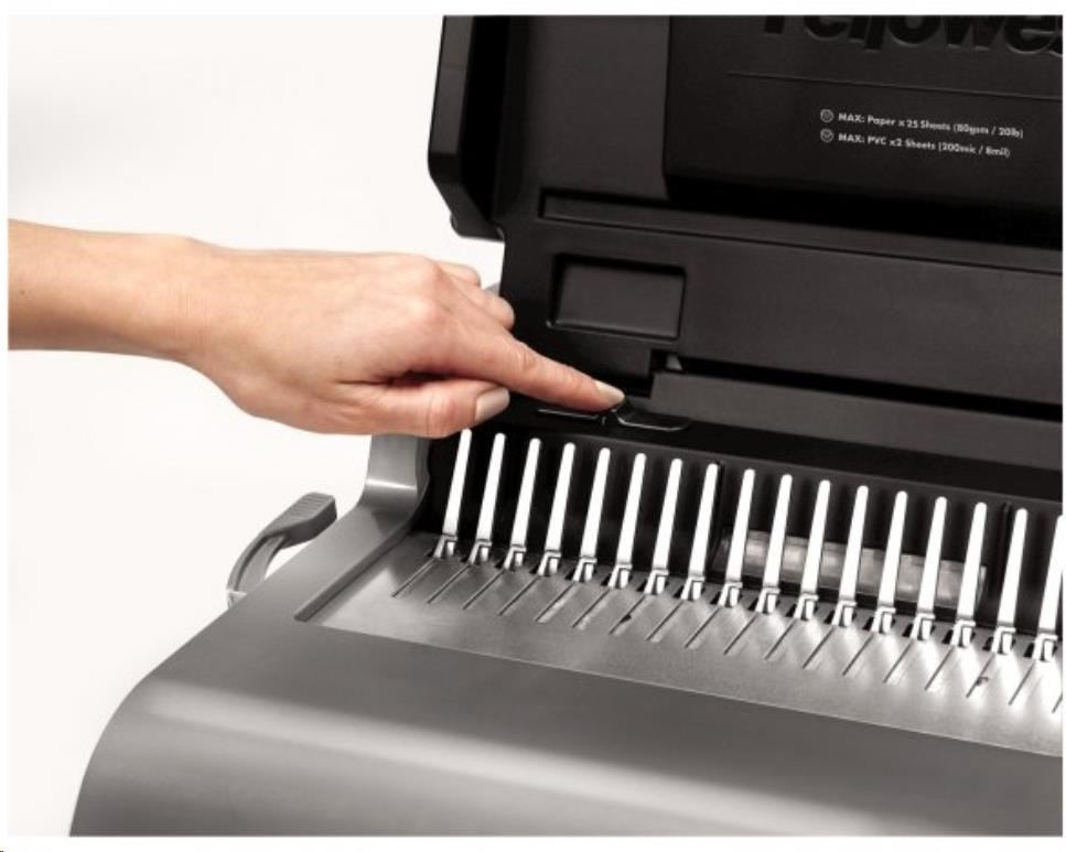Špičkový design, funkční preciznost a komfortní obsluha jsou vlastnosti tohoto vazače s elektrickým pohonem děrovacího nástroje. Děrovací kapacita až 25 listů 80 g papíru. Kapacita vazby až 500 listů. Je optimální volbou pro komfortní práci při kancelářském použití. Vkládání děrovaných listů shora a přesné nastavení dorazu svazku významně pomáhá pro zajištění jeho bezchybné perforace.