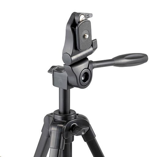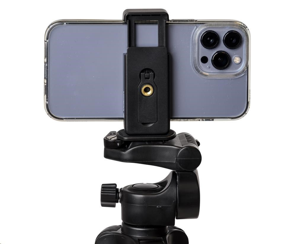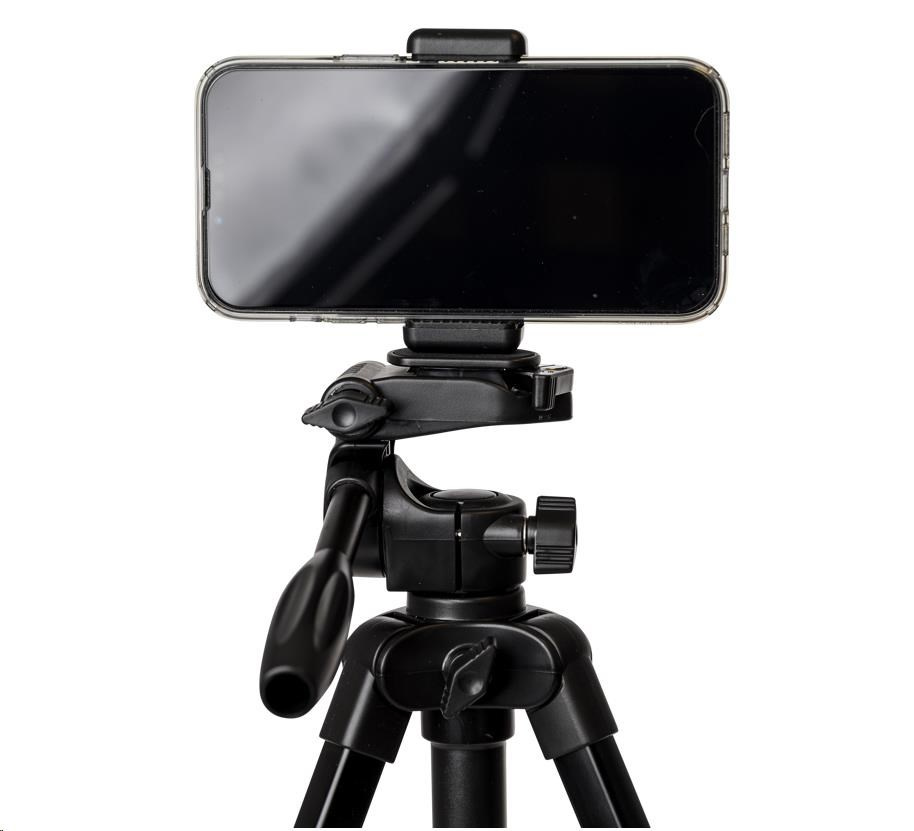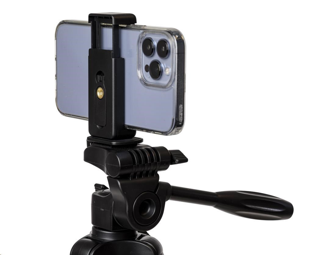 A lightweight aluminium tripod with a three way pan/tilt head and smartphone holder. It can reach a maximum height of 123cm, and can hold up to 2kg. This tripod is perfect for you who use a smaller camera or smartphone