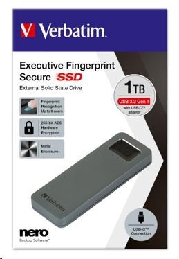 VERBATIM externí SSD 512GB, Executive Fingerprint Secure SSD, USB 3.2 Gen 1/USB-C, (W:356 MB/s, R:344 MB/s), šedá