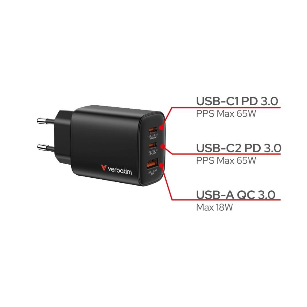 VERBATIM GaN Nabíječka Essentials 65W, 2xUSB-C, 1xUSB-A, černá
