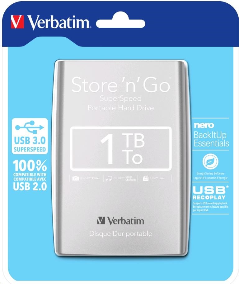 Přenosný pevný disk Verbatim Store n Go nabízí velkokapacitní úložiště s rozhraním USB 3.0 Super Speed. Rozhraní USB 3.0 nabízí až desetkrát rychlejší přenos dat než USB 2.0 (podle rychlosti sběrnice USB), takže umožňuje extrémně rychlý přenos dat na cestách.