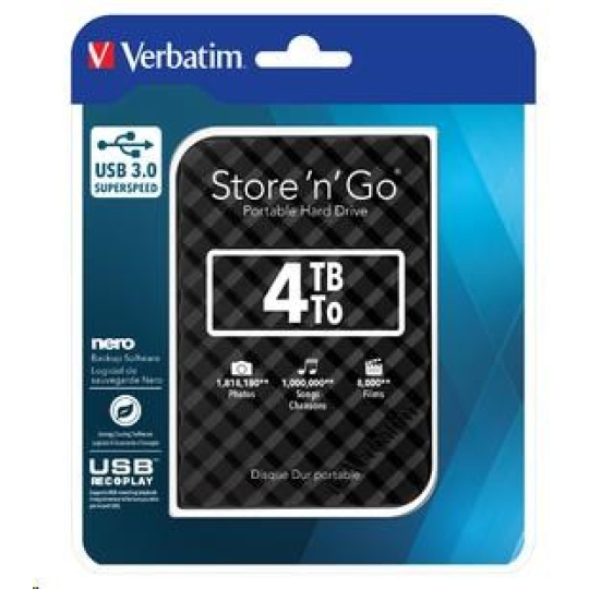 VERBATIM HDD 2.5" 4 TB Store 'n' Go Portable Hard Drive USB 3.0, Black Special Features: Colours available: Black, Silver, White, Red & Blue Capacities available: 500GB, 1TB & 2TB High speed, high capacity storage. A fast & safe solution to expand storage or backup files USB 3.0 SuperSpeed - for ultra fast data transfer Nero Backup Software Energy Saving Software USB REC & PLAY* - supports USB recording/ playback 2 year limited warranty** System requirements: PC or Mac with USB 3.0 Windows XP / Vista / Windows 7 & 8 Mac OS X 10.4 or higher Pack Contents: Portable Hard Drive / USB 3.0 Cable / Nero Backup Software / Green Button Energy Saving Software / Verbatim Formatter / Quick Start Guide / User Guide (pre-loaded on the drive).