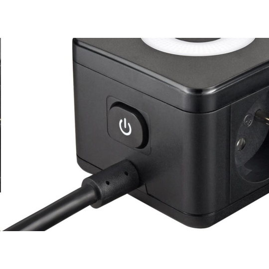 Viking síťový adaptér YC23L, 2x 230 V, 1x USB-A, 2x USB-C, dotykové světlo, délka 1,4 m, černá