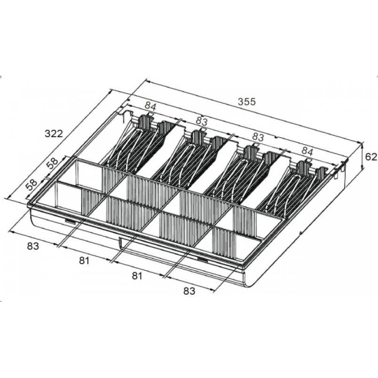 Slouží k ukládání mincí, dodatečně lze zakoupit nastavitelné přepážky pro zvýšení počtu přihrádek pro jednotlivé mince. Rozměry: 361 (Š) x 45 (V) x 125 (H) mm.