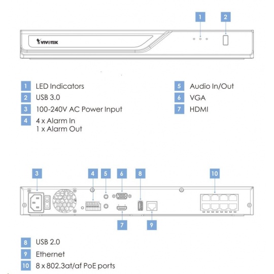 NVR umožňuje vstup z až 8 kanálů (kamery, videoservery). Podporováno je rozlišení 8 MPx neboli 4K UHD při maximální šířce pásma 64 Mb/s. Pro výstup, který lze realizovat až ve 4K, můžete použít rozhraní HDMI, k dispozici je také VGA výstup (max. FullHD). Jednou z hlavních předností tohoto modelu je možnost napájení až 8 kamer přes Ethernet. K dispozici je osm portů s funkcí PoE (celkem max. 120 W), které odpovídají standardům 802.3af a 802.3at. Pomocí správy PoE přes webové rozhraní má uživatel přehled o odběru jednotlivých kamer a může je restartovat.