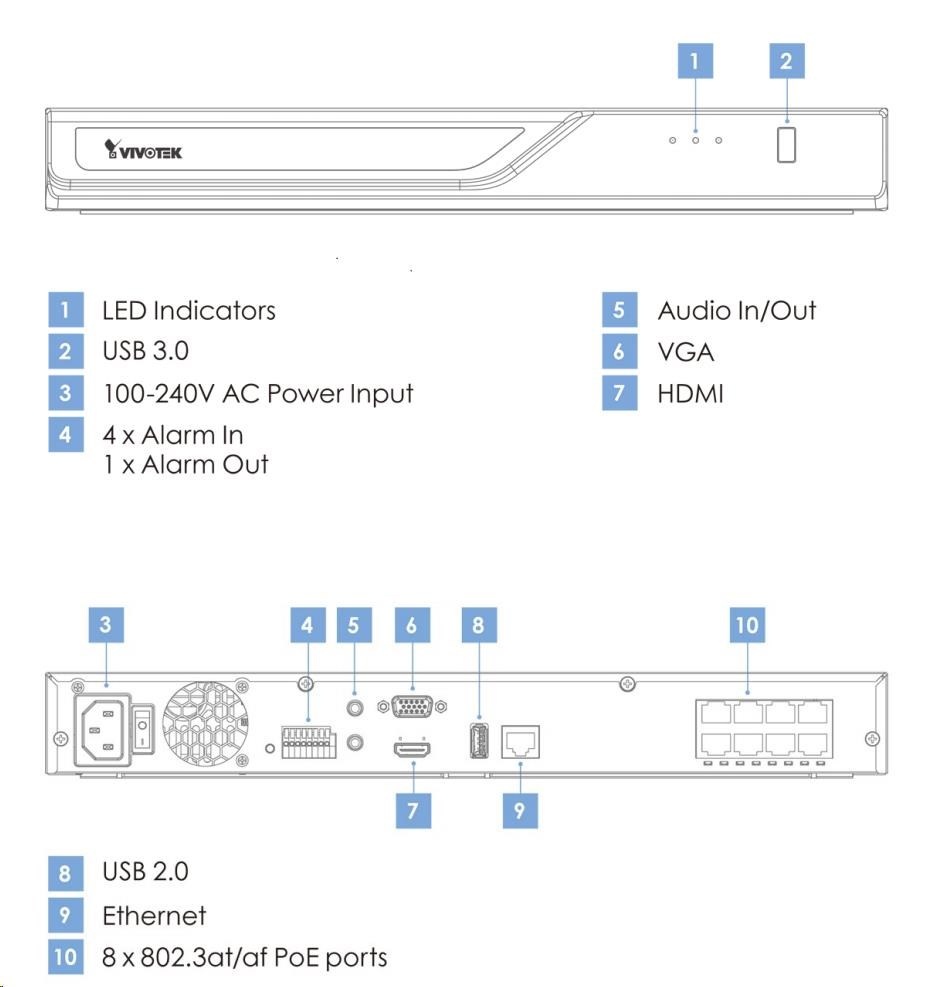 NVR podporuje technologii Smart VCA implementované v kamerách, která je založena na Deep learning (strojové učení) technologiích. Umožňuje snadno prohledávat záznamy podle jednoho nebo více typů událostí. Zařízení je vybaveno dvěma porty USB a je kompatibilní s IP kamerami třetích stran standardu ONVIF Profile S. Prostřednictvím webového rozhraní lze požádat technické oddělení výrobce VIVOTEK o pomoc formou vzdálené připojení do Vašeho NVR.