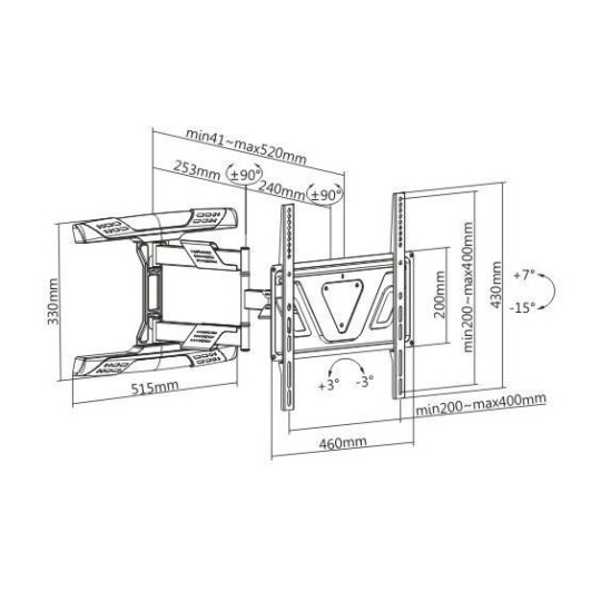 Výsuvný otočný sklopný držák Tv Fiber Mounts Super-1 Nástěnný držák vynikající kvality a parametrů na Tv 32-65", otáčení +/-90°, naklápění +7° / -15°, vzdálenost od zdi 41-520mm, VESA 200x100 až 400x400, nosnost 35kg Televizní držák SUPER-1 poskytuje opravdu širokou škálu polohovatelnosti - výsouvání od zdi 41mm až 520mm, otáčení na obě strany až +/- 90°, naklápění obrazovky +7° až -15°, korekci roviny +/- 3°. Konstrukce držáku je opláštěna krytkami s funkcí vedení kabeláže. Držák Fiber Mounts Super-1 je ideální na televize s úhlopříčkou 32" až 65", které mají hmotnost do 35kg a podporují VESA standardy od 200x100 do 400x400. Držák uspokojí i náročnější uživatele, kteří požadují nejen vynikající kvalitu ale i pěkný dizajn a snadné polohování. Držák je dodáván včetně instalačního materiálu. Záruka 5 let Držák na televize Fiber Mounts Super-1 Technické údaje: nosnost 35kg podporuje VESA standardy 200x100 až 400x400 ideální na televize s úhlopříčkou 32" až 65" výsuvný, nastavení vzdálenosti od zdi od 41mm až do 520mm otáčení na obě strany +/- 90° naklápění televize dolů až o -15° a nahoru až o +7° korekce roviny +/- 3° velký nástěnný úchyt pro bezpečné ukotvení dizajnové krytky pro vedení kabeláže velmi pevná a bezpečná konstrukce krásný vzhled barevné provedení černé záruka 5 let Držák na LCD LED Tv Fiber Mounts Super-1 Držák na televize Fiber Mounts Super-1 podporuje VESA standardy: VESA 200x100 VESA 200x200 VESA 300x200 a 200x300 VESA 300x300 VESA 400x200 a 200x400 VESA 400x300 a 300x400 VESA 400x400 Nástěnný držák na televize Fiber Mounts Super-1 je vhodný na všechny typy, značky i velikosti televizí, které mají hmotnost do 35kg a které podporují kterýkoliv z výše uvedených VESA standardů. Na velikosti (úhlopříčce) televize vůbec nezáleží. Držák na Tv Fiber Mounts Super-1 umožňuje otočení kolko ke zdi televizorům, které mají šířku maximálně 94cm nebo menší. Televize s větší šířkou otočíte o něco méně..