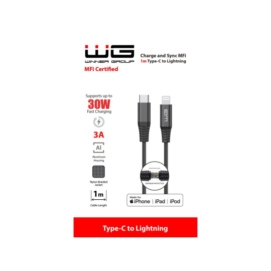 Prémiový kabel WG s certifikací MFi (Made for iPhone/iPad/iPod) garantuje bezproblémovou kompatibilitu a bezpečné používání. Podporuje výkon až 30 W, takže umožňuje bleskové nabíjení i rychlý přenos dat. Díky kvalitní konstrukci z hliníku a opleteného nylonu je kabel odolný a vhodný pro každodenní používání.