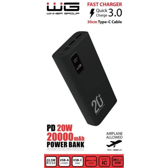 WG - Power Bank 20000 mAh, USB-C PD 20W + USB-A QC 3.0 22.5W, černá