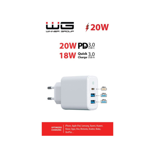WG - Síťová nabíječka 3x USB, 1x USB-A QC 3.0 + 1x USB-A QC 3.0 + 1x USB-C PD 3.0, bílá