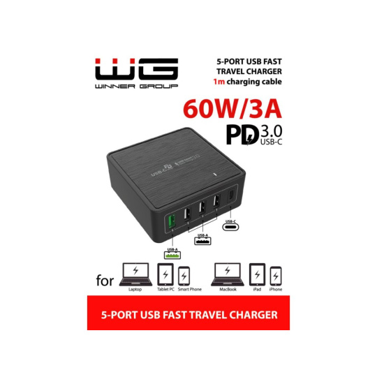 WG - Síťová nabíječka 5x USB 60W, 1x USB-A QC 3.0 + 3x USB-A Smart IC + 1x USB-C PD, černá