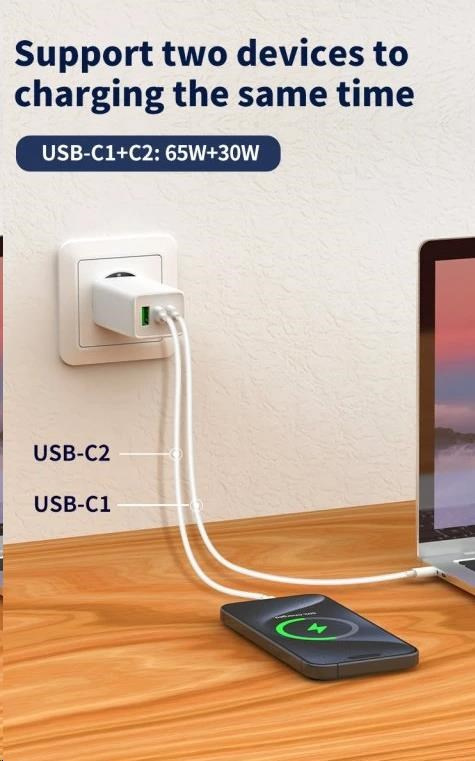- USB-C1+C2: 65W + 30W, 30W + 65W