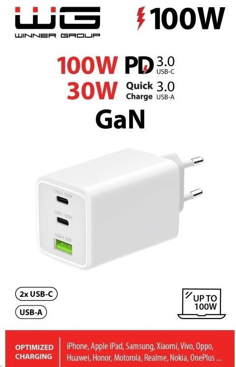 WG - Síťová nabíječka GaN 100W, 3x USB, 1x USB-A + 2x USB-C, white