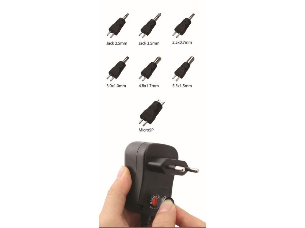 Vyměnitelné koncovky: 2.35 x 0.7mm, 3.5 x 1.35mm, 4 x 1.7mm, 5 x 2.1mm, 5.5 x 2.5mm, 5.5 x 2.1mm, Jack 2.5mm, Jack 3.5mm, Micro 5P, 2.5 x 0.7mm, 3 x 1mm, 4.8 x 1.7mm, 5.5 x 1.5mm.