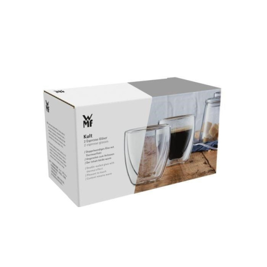 Sklenice na espresso z kolekce WMF Kult představují dokonalou rovnováhu mezi moderními funkcemi a poutavým designem. Dvoustěnná konstrukce termo skla udržuje horký i studený obsah déle v perfektní teplotě - ideální pro širokou škálu použití, od klasického espressa po horké nebo studené dezerty, amuse-bouche a mnoho dalšího - s bezpečným tepelně odolným sklem pro pití bez manipulace, které je chladné na dotek a bez kondenzace.