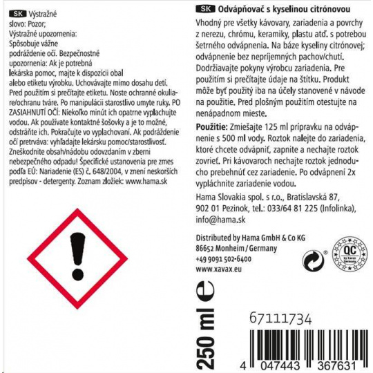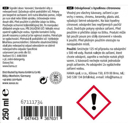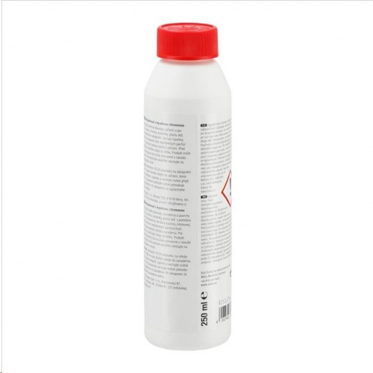 - přípravek pro rychlé odvápnění - vhodný pro všechny zařízení na přípravu čaje, kávy, pressa, kapslové kávovary, i plně automatické kávovary, vařiče vajíček, rychlovarné konvice, ponorné vařiče, hrnce, nerezové hrnce a pánve, dřezy, povrchy z nerezové oceli, chromu, keramiky a plastu atd., které vyžadují šetrné odvápnění - na bázi kyseliny citronové: odvápnění bez nepříjemných pachů/chutí - bezpečnostní uzávěr proti náhodnému otevření dětmi - objem: 250 ml - vyrobeno v Německu Upozornění: Dodržujte pokyny výrobce zařízení. Před použitím si přečtěte údaje na štítku. Před plošným použitím otestujte na nenápadném místě. Použití: Smíchejte 125 ml přípravku na odvápnění s 500 ml vody. Roztok nalejte do zařízení, které chcete odvápnit, zapněte a nechejte roztok přejít varem. U kávovarů nechejte roztok jednoduše projít zařízením. Po odvápnění 2x vypláchněte zařízení vodou..